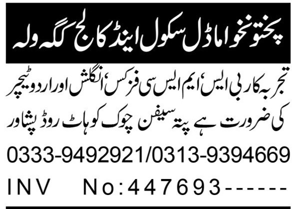Pakhtunkhwa Model School jobs advertisement dated about 5 December 2025 in daily Aaj Newspaper invites application for the vacant post of urdu teacher, physics teacher, english teacher and teacher in Kohat Road Peshawar, peshawar Khyber Pakhtunkhwa KPK Pakistan. M.sc, Bachelor and Master etc. educational qualification will be preferred.