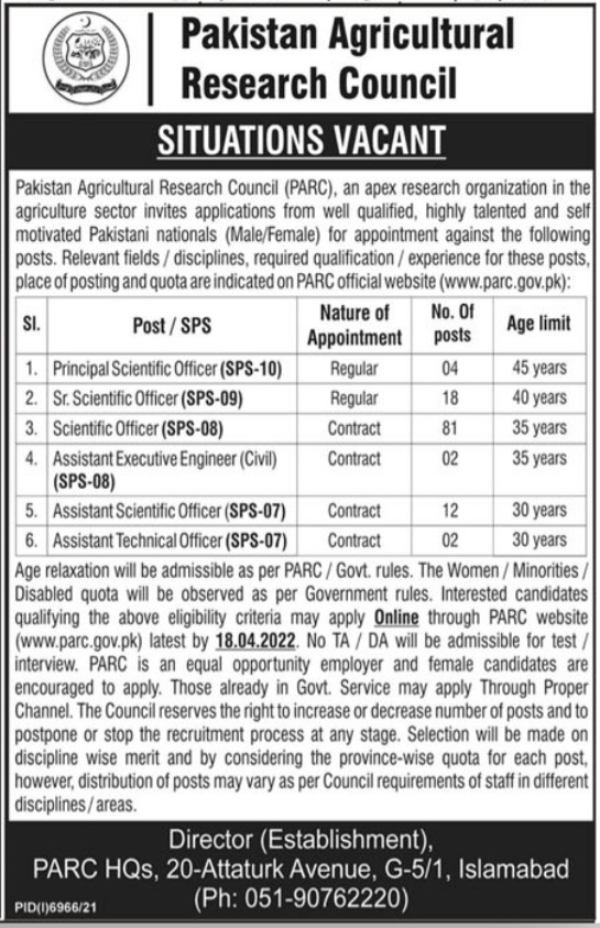 Vacancies in Pakistan Agricultural Research Council Advertisement April 2022