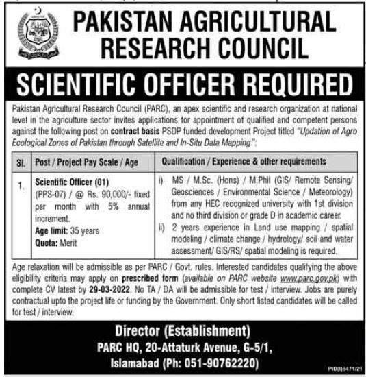 Pakistan Agriculture Research Council jobs advertisement dated about 15 March 2022 in daily Dunya Newspaper invites application for the vacant post of scientific officer in Islamabad, islamabad Islamabad Pakistan. Educational qualifications required Master, M.sc and MS etc.