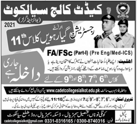 Cadet College is a special military school system has announced admissions in Intermediate, FA, FSc Pre Engineering, FSc Medical and ICS in Sialkot Punjab Pakistan 2021. Read newspaper ad for exact details.