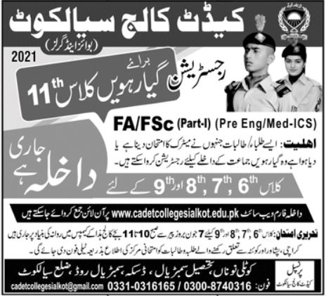 Pakistan Army Cadet College Sialkot Boys & Girls invites applications for admissions in Class 6th, Class7th, Class 8th, Class 9th, Class 11th Part I, FA, FSc Pre Engineering, FSc Pre Medical and ICS. Read newspaper ad for exact details.