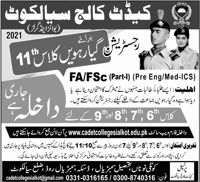 Cadet College is a special military school system has announced admissions in Class 6th, Class 7th, Class 8th, Class 9th and Class 11th in District Sialkot Punjab Pakistan 2021. Read newspaper ad for exact details.