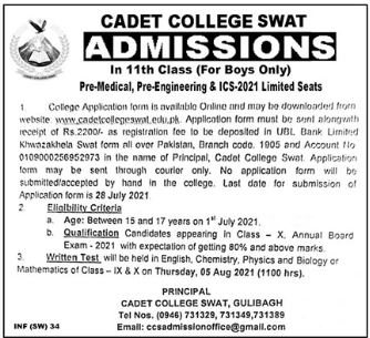 Cadet College is a special military school system invites applications for admissions in Class 11th Pre Medical, Pre Engineering & ICS in Swat Khyber Pakhtunkhwa KPK 2021. Read newspaper ad for exact details.
