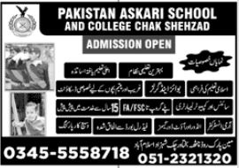 Pakistan Askari School & College Chak Shehzad Admissions 2024 for Intermediate