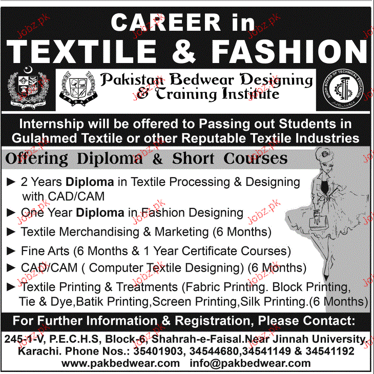 Pakistan Bedwear Designing & Training Institute Admission in Karachi. Read newspaper ad for exact details.