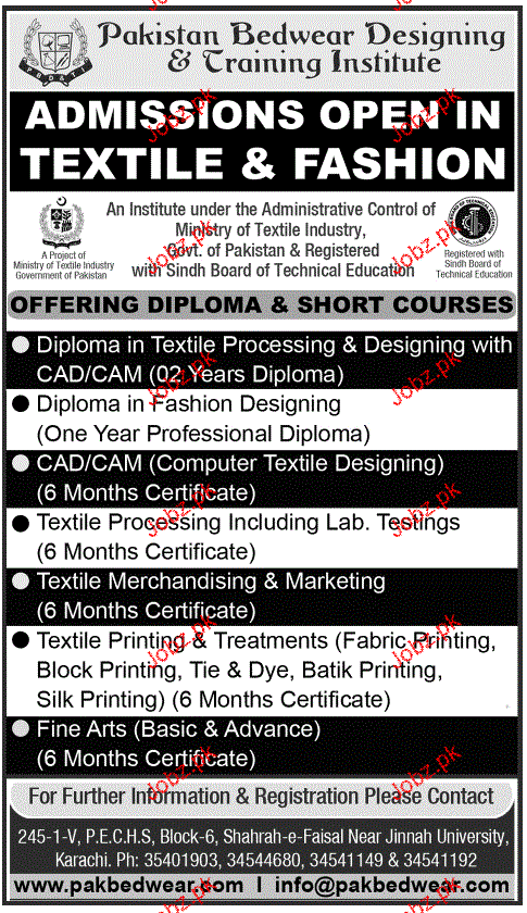 Pakistan Bedwear Designing & Training Institute Admission in Diplomas in Lahore. Read newspaper ad for exact details.
