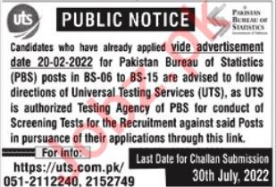 Pakistan Bureau of Statistics issued public notice for those candidate who have already applied vide advertisement date 20 February 2022 for the PBS posts in BPS 06 to BPS 15 are advised to follow directions of Universal Testing Services UTS as UTS is authorized Testing Agency of PBS for conduct of Screening Tests for the recruitment against said posts in pursuance of their applications through below mentioned link.