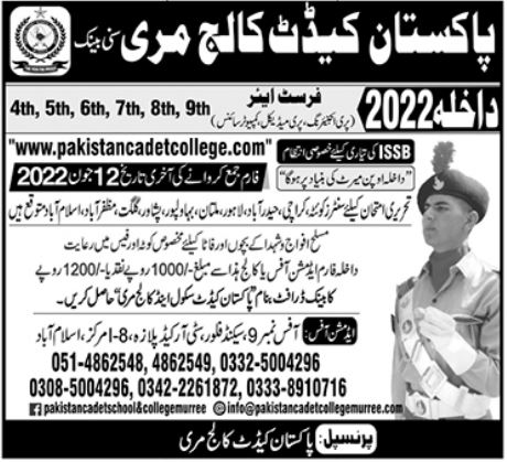 Pakistan Cadet College has announced admissions 2022 for Class 4th to Class 9th, Intermediate, Pre Engineering, Pre Medical, Computer Science . Eligible students who qualify as per admission criteria in Pakistan Cadet College Murree Punjab Pakistan can apply in Army Army for academic year 2022. Eligible candidates for admissions in Primary, Middle, Matric and Intermediate can apply as per Private institute criteria and before closing date 12 June 2022 after reading advertisement online. Read newspaper ad for exact details.