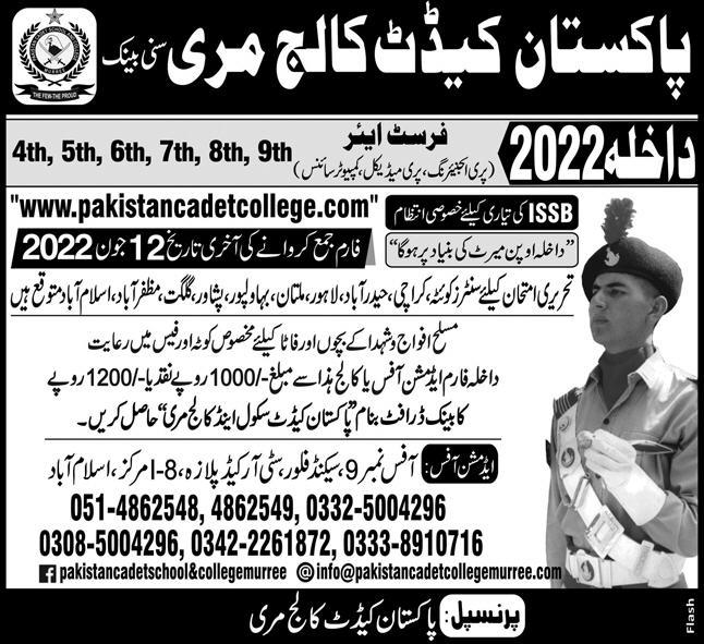 Pakistan Cadet College has announced admissions 2022 for 4th Class, 5th Class, 6th Class, 7th Class, 8th Class, 9th Class. Students who want to take admissions in Pakistan Cadet College Murree Punjab Pakistan for academic year 2022 to continue education in Army College can apply. Students for admissions in Middle, Matric and Primary & criteria can apply as per Government institute admission policy 2022 before closing date June 12, 2022 as per advertisement. Read newspaper ad for exact details.