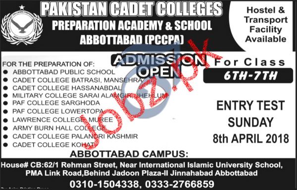 Pakistan Cadet College Preparation Academy & School Admission in Class VI and Class VII in Abbottabad. Entry test will be held on Sunday 08 April 2018. Read newspaper ad for exact details.