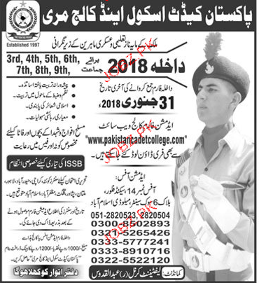 Pakistan Cadet School adn College Admission Class III to IX in Murree. Last date for submission of admission forms is 31 January 2018. Admission forms can also be download from college website. Read newspaper ad for exact details.
