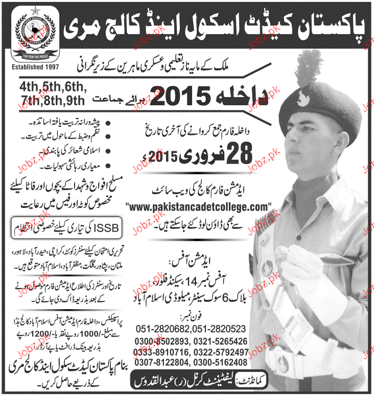 Pakistan Cadet School and College Admission in Class IV to IX in Murree Read newspaper ad for exact details.