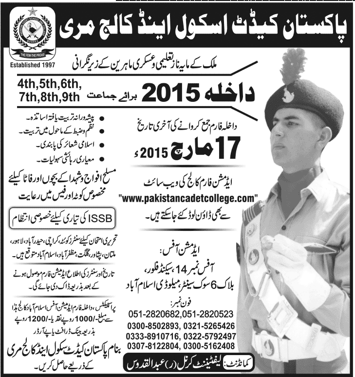 Pakistan Cadet School and College Admission in Class IV to IX in Murree. Read newspaper ad for exact details.
