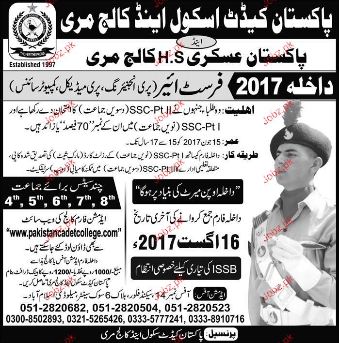 Pakistan Cadet School and College Admission in Class XI in MUrree. Read newspaper ad for exact details.