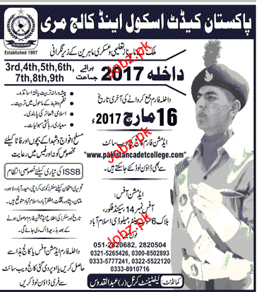 Pakistan Cadet School and College Admission in Class III to IX in Murree. Read newspaper ad for exact details.
