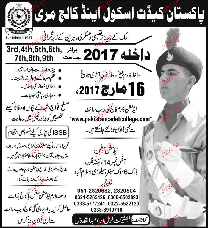 Pakistan Cadet School and College Admission in Class VI to IX in Murree. Read newspaper ad for exact details.