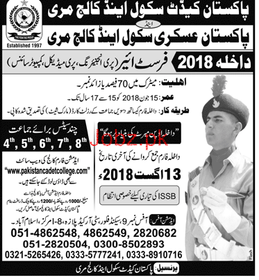 Pakistan Cadet School and College Murree Admission in Class XI Pre Medical, PRe Engineering, Pre Medical, Computer Sciences, Class IV, Class V, Class VI, Class VII in Murree. Read newspaper ad for exact details.