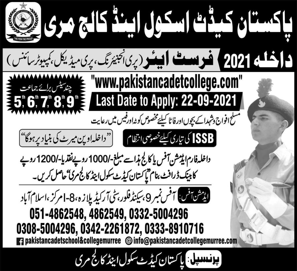 Pakistan Cadet School & College invites applications for admissions in Class XI Pre Engineer, Pre Medical and Computer Science in Murree Punjab Pakistan 2021. Read newspaper ad for exact details.