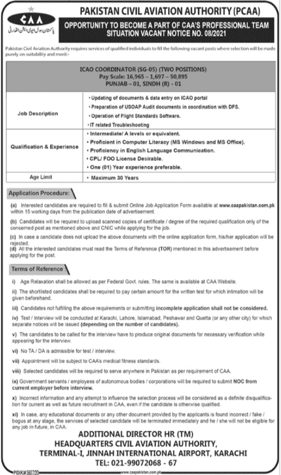 Vacancies in Pakistan Civil Aviation Authority CAA Advertisement June 2021