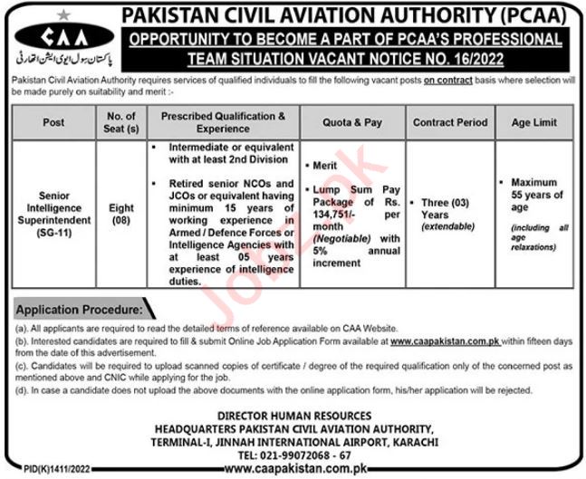 Pakistan Civil Aviation Authority CAA Karachi, karachi Sindh Pakistan invites applications from eligible candidates for the post of intelligence superintendent as per advertisement of November 20, 2022 published in daily The News Newspaper. Educational qualifications required Intermediate etc.