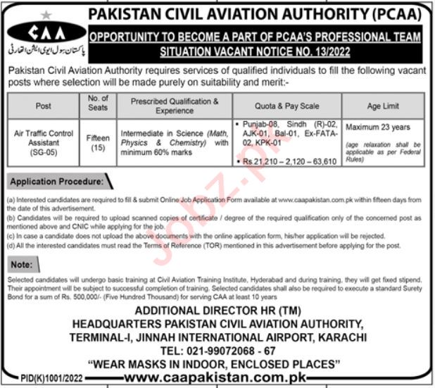 Pakistan Civil Aviation Authority CAA Karachi, karachi Sindh Pakistan invites applications from eligible candidates for the post of air traffic control assistant as per advertisement of October 16, 2022 published in daily Jang Newspaper. Preferred Education is Intermediate etc.