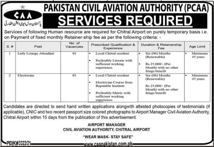 Pakistan Civil Aviation Authority CAA Chitral, chitral Khyber Pakhtunkhwa KPK Pakistan invites applications from eligible candidates for the post of electrician and lady lounge attendant as per advertisement of May 12, 2022 published in daily K2 Newspaper. Candidates with Middle and Matric etc. educational background will be preferred.