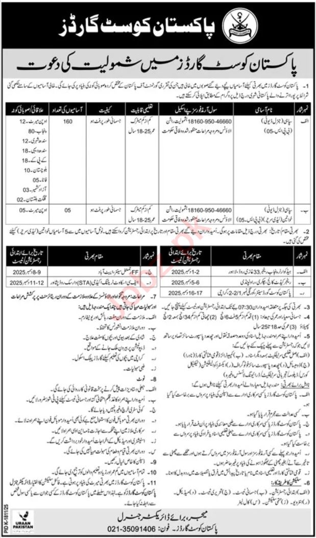 Pakistan Coast Guards jobs advertisement dated about 23 November 2025 in daily Jang Newspaper invites application for the vacant post of sipahi and sipahi general duty in Karachi, karachi Sindh Pakistan. Matric and Intermediate etc. educational qualification will be preferred.