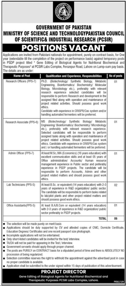 Pakistan Council of Scientific and Industrial Research PCSIR Lahore, lahore Punjab Pakistan invites applications from eligible candidates for the post of research officer, research associate, lab technician, admin officer and office assistant as per advertisement of August 25, 2024 published in daily Jang Newspaper. Master, MS and Bachelor etc. educational qualification will be preferred.
