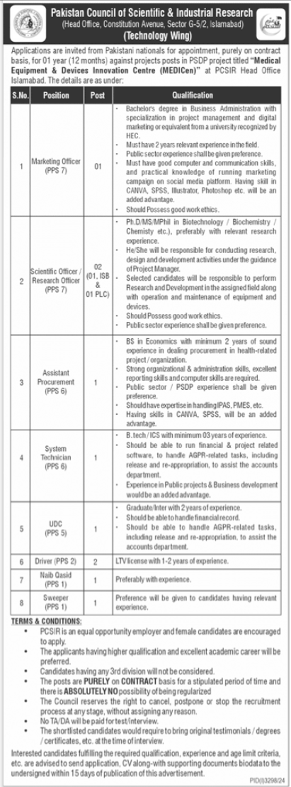 Medical Equipment & Devices Innovation Centre, Pakistan Council of Scientific and Industrial Research PCSIR Islamabad, islamabad Islamabad Pakistan invites applications from eligible candidates for the post of driver, assistant procurement, ltv driver, scientific officer, marketing officer, sweeper, research officer, naib qasid, udc and system technician as per advertisement of November 16, 2024 published in daily Jang Newspaper. Candidates with DAE, BBA, Mphil, Bachelor, B.E, BA, MS, Middle, Intermediate, Phd and Primary etc. educational background will be preferred.