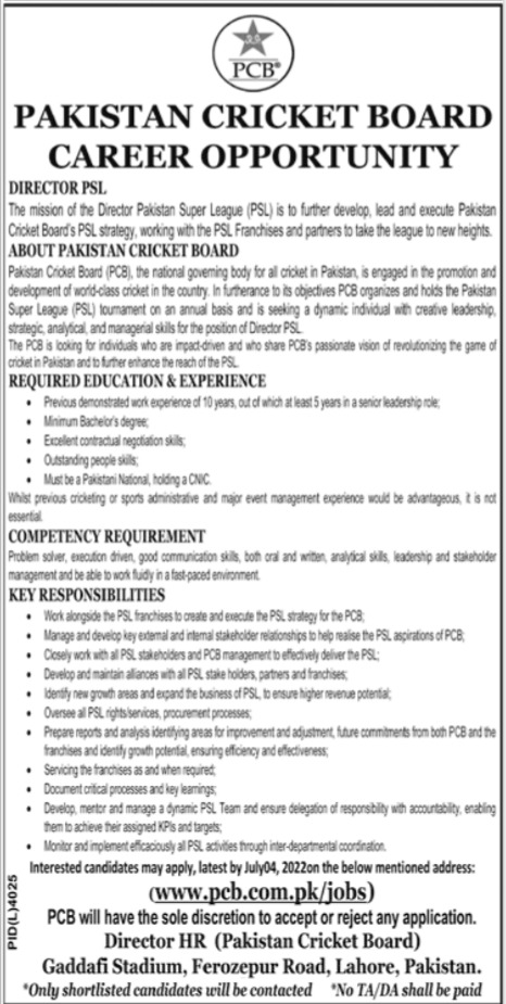 Vacant posts including director psl are announced in Pakistan Cricket Board PCB Lahore, lahore Punjab Pakistan as per 19 June 2022 advertisement in daily Jang Newspaper. Master and Bachelor etc. educational qualification will be preferred.