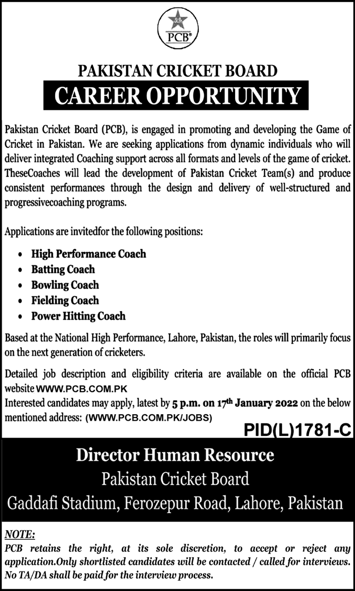 Vacancies in Pakistan Cricket Board PCB Advertisement December 2021