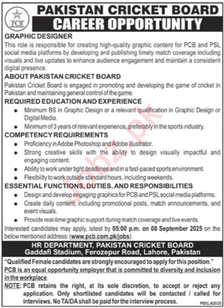 Pakistan Cricket Board PCB jobs advertisement dated about 24 August 2025 in daily Jang Newspaper invites application for the vacant post of graphic designer in Lahore, lahore Punjab Pakistan. Preferred Education is Bachelor, MS and Master etc.