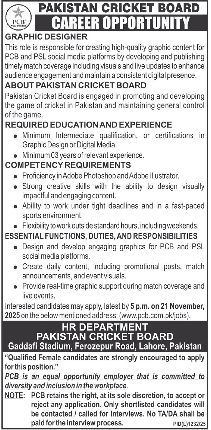 Pakistan Cricket Board PCB invites applications for job positions advertised in daily Express Tribune dated 7 November 2025 for following vacancies in Gaddafi Stadium Lahore, lahore Punjab Pakistan.