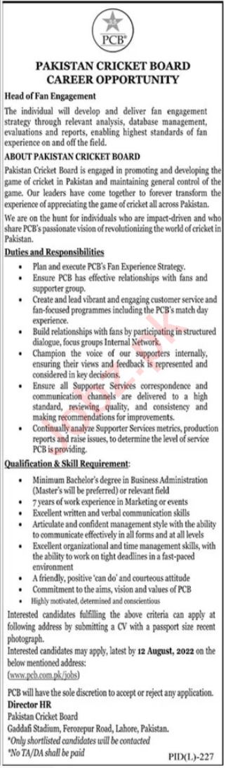Vacancies in Pakistan Cricket Board PCB Advertisement July 2022