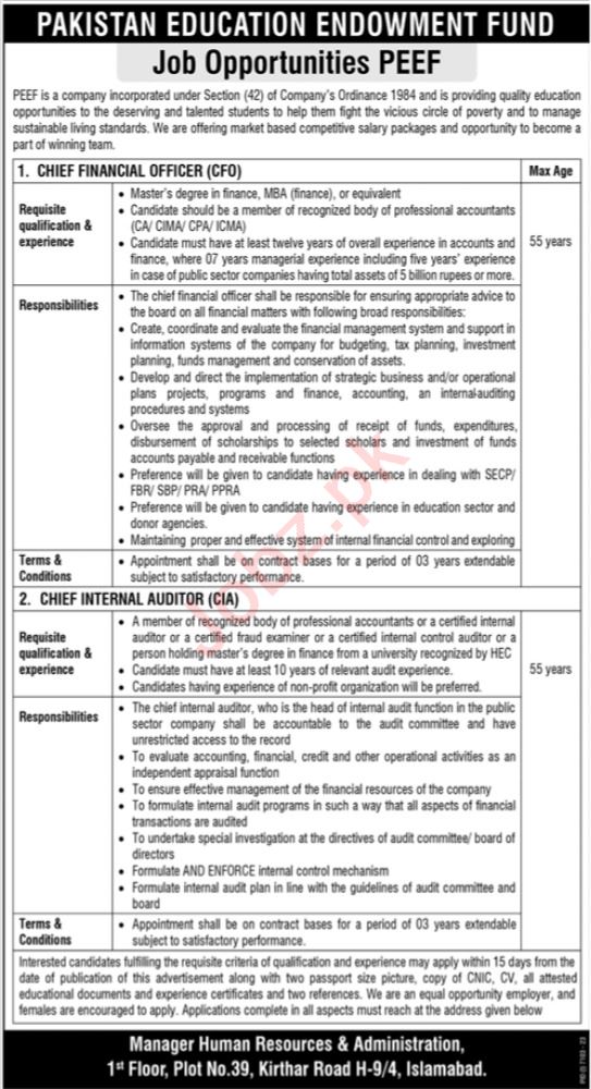 Punjab Education Endowment Fund PEEF invites applications for job positions advertised in daily Jang dated 19 May 2024 for following vacancies in Islamabad, islamabad Islamabad Pakistan.