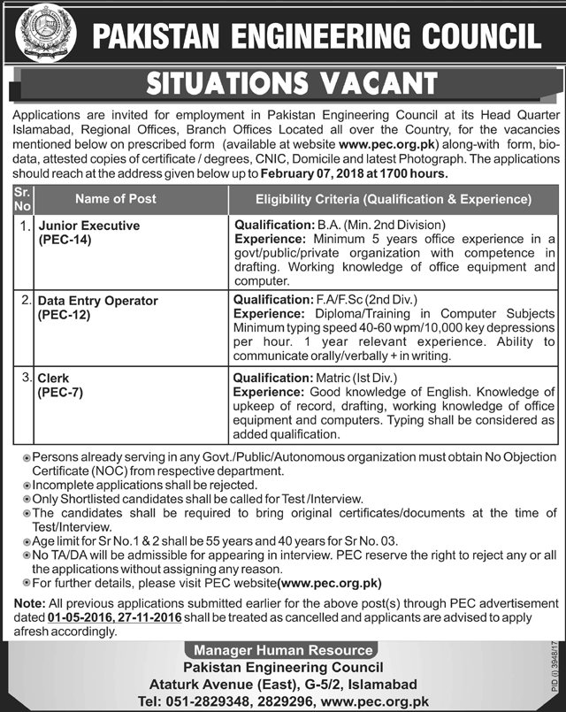 Pakistan Engineering Council PEC Jobs 2018 For Executive