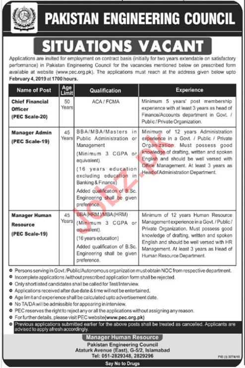 Vacancies in Pakistan Engineering Council Advertisement January 2019