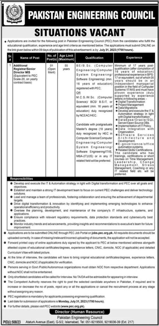 Pakistan Engineering Council Islamabad, islamabad Islamabad Pakistan invites applications from eligible candidates for the post of director mis and additional registrar as per advertisement of July 23, 2023 published in daily Jang Newspaper. Bachelor and B.E etc. educational qualification will be preferred.