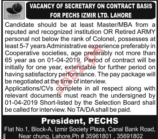 Latest PECHS lzmir Housing Society Secretarial Posts Lahore 2025