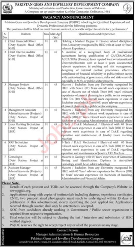 Vacant posts including chief internal auditor, gemologist, chief financial officer, laser marketing technician, xrf technician, management associate admin accounts, assistant manager admin accounts and manager projects are announced in Pakistan Gems and Jewelry Development Company Karachi, karachi Sindh Pakistan as per 2 February 2025 advertisement in daily Jang Newspaper. Educational qualifications required Master, Bachelor, DAE, ACCA, CA and MBA etc.