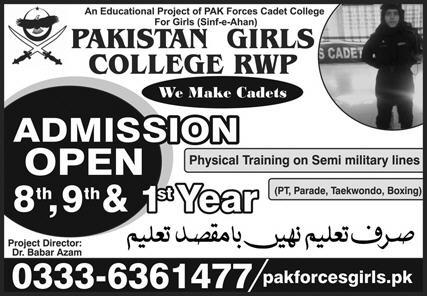 Pakistan Girls College 8th Class, 9th Class, Intermediate Part I, 1st Year admissions 2022 has been announced. Eligible students can apply for academic admissions 2022 in Pakistan Girls College Rawalpindi Punjab Pakistan for Army College. Eligible students for fulfilling criteria for admissions in Matric, Middle and Intermediate can enroll as per Government admission policy 2022 till closing date 13 July 2022. Read newspaper ad for exact details.