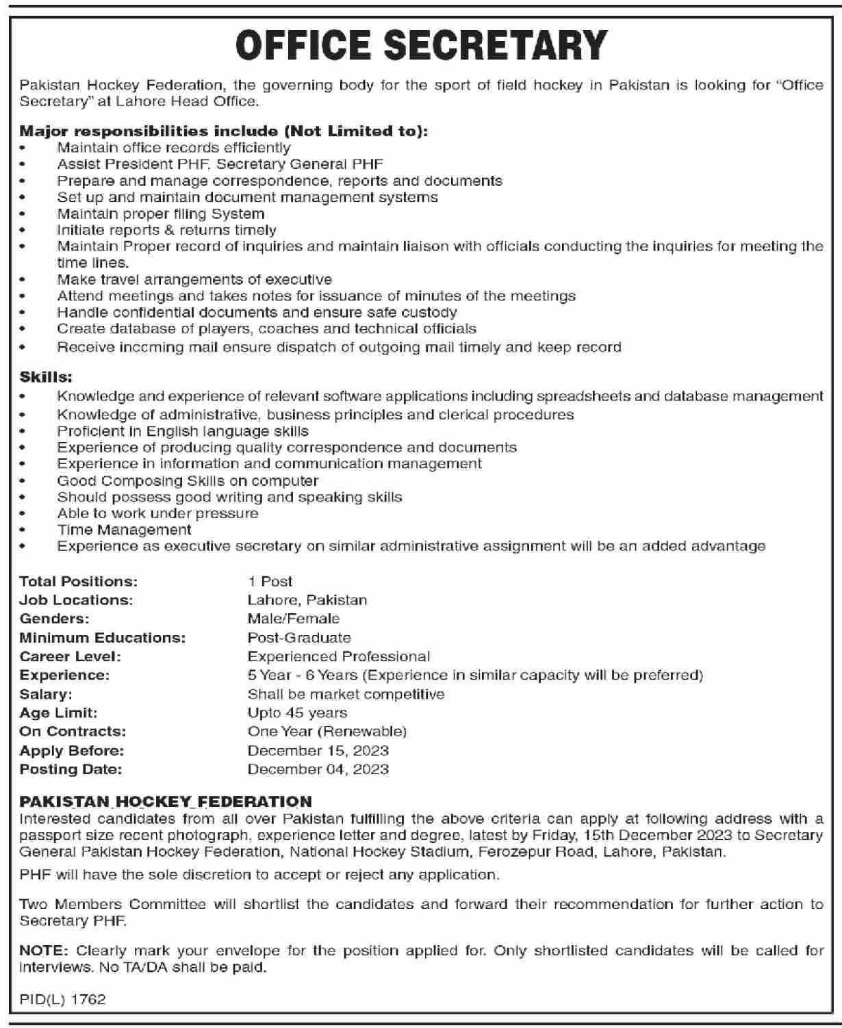 Pakistan Hockey Federation PHF Lahore Job 2023