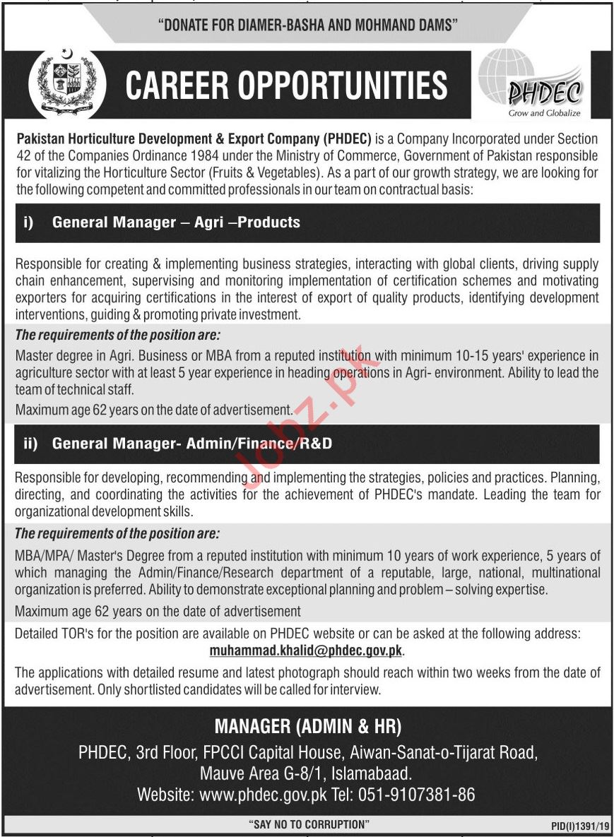 Pakistan Horticulture Development & Export Company PHDEC invites applications from highly qualified and well educated candidates for the positions of General Manager Agriculture, General Manager Product, General Manager Admin, General Manager Finance, General Manager Research and General Manager Developer in Islamabad.