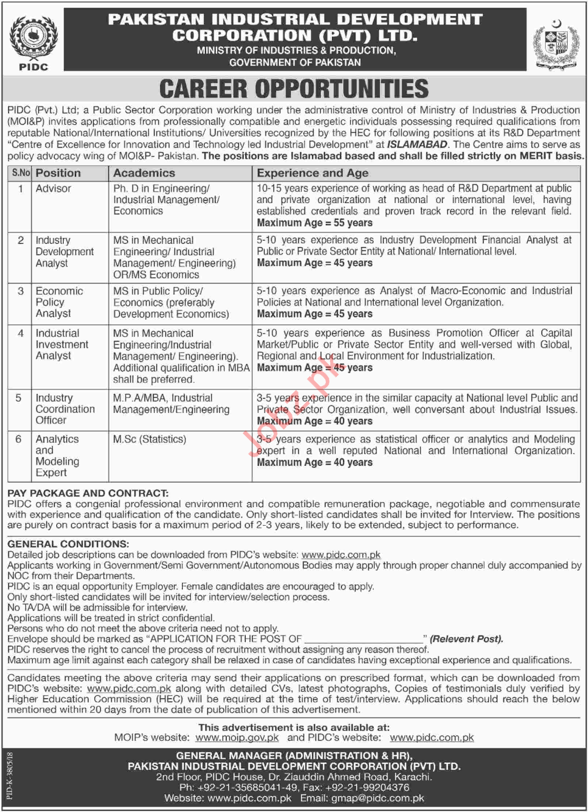 Latest Pakistan Industrial Development Corporation PIDC Industrial Posts Islamabad 2025