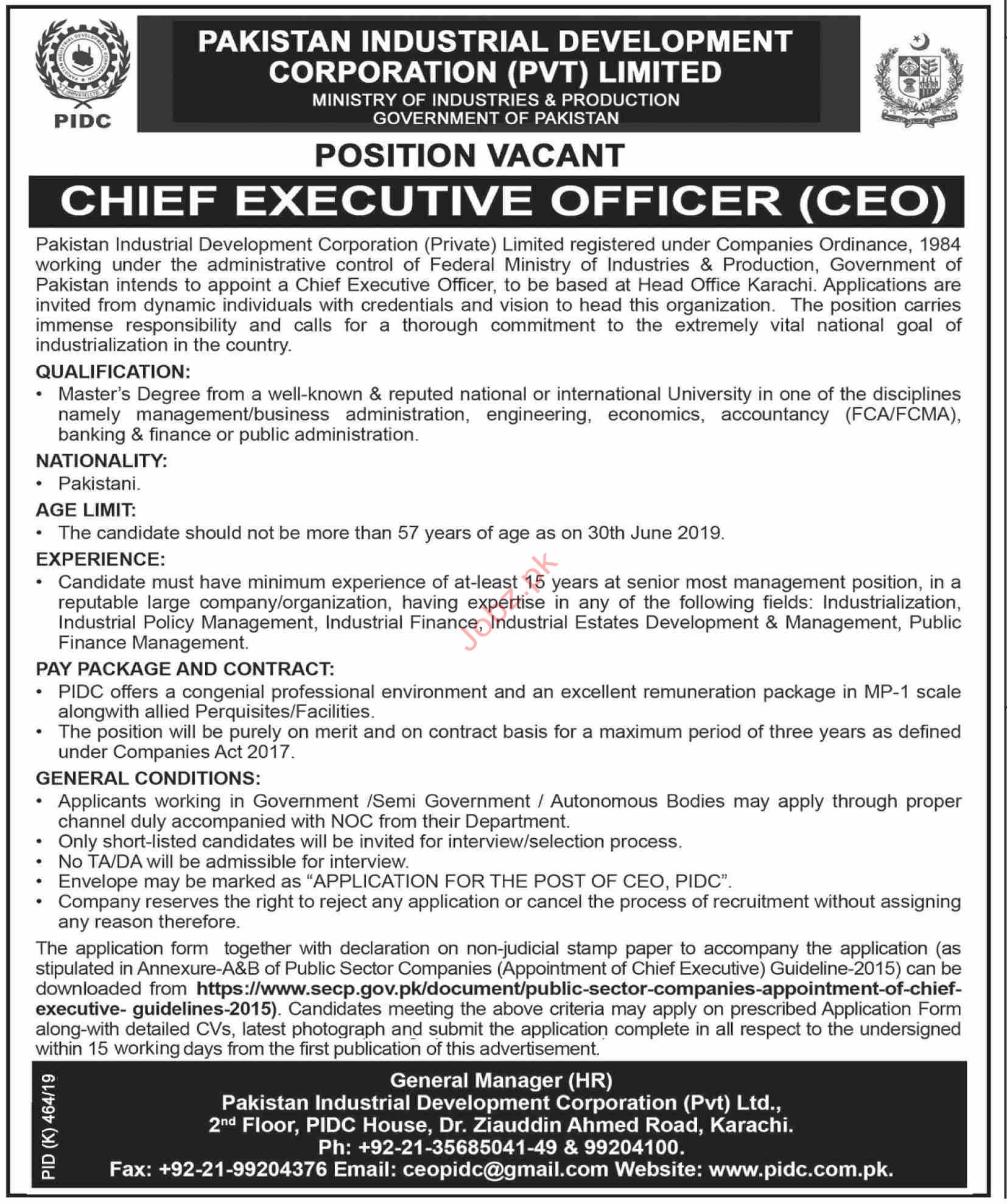 Vacancies in Pakistan Industrial Development Corporation PIDC Advertisement August 2019