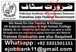Pakistan Institute of Computer Sciences PICS Islamabad, Pakistan seeks candidates for the posts of Teacher, Physics Teacher, Chemistry Teacher, Biology Teacher, Maths Teacher, English Teacher, Computer Studies Teacher, Pakistan Studies Teacher, Urdu Teacher, Montessori Teacher.