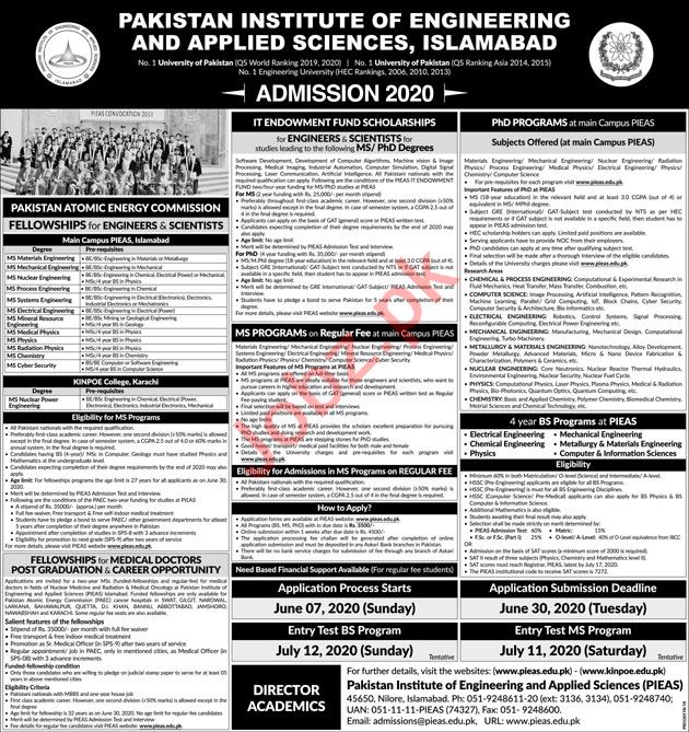 Pakistan Institute of Engineering PIEAS Admissions 2020