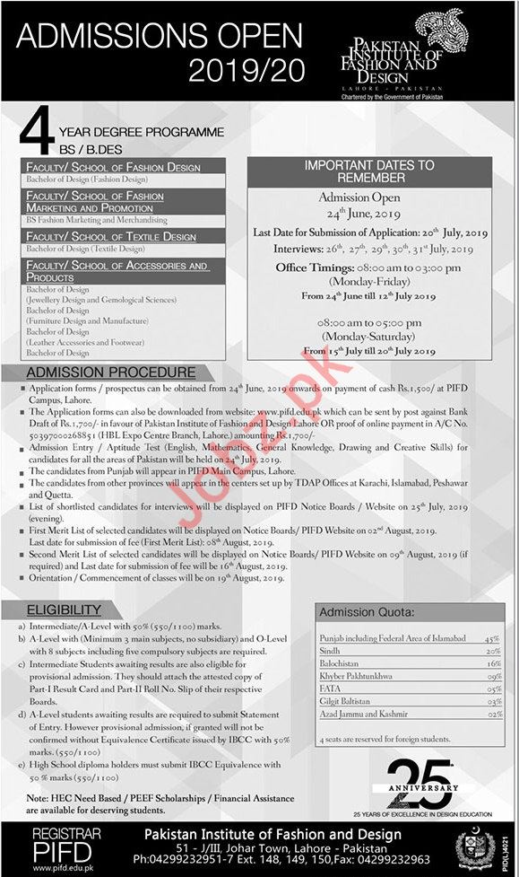 Pakistan Institute of Fashion & Design PIFD is offering admissions for 4 Year Degree Programme BS Bachelor of Science, BDES Bachelor of Design and Bachelor of Science, Bachelor of Fashion Design. Read newspaper ad for exact details.