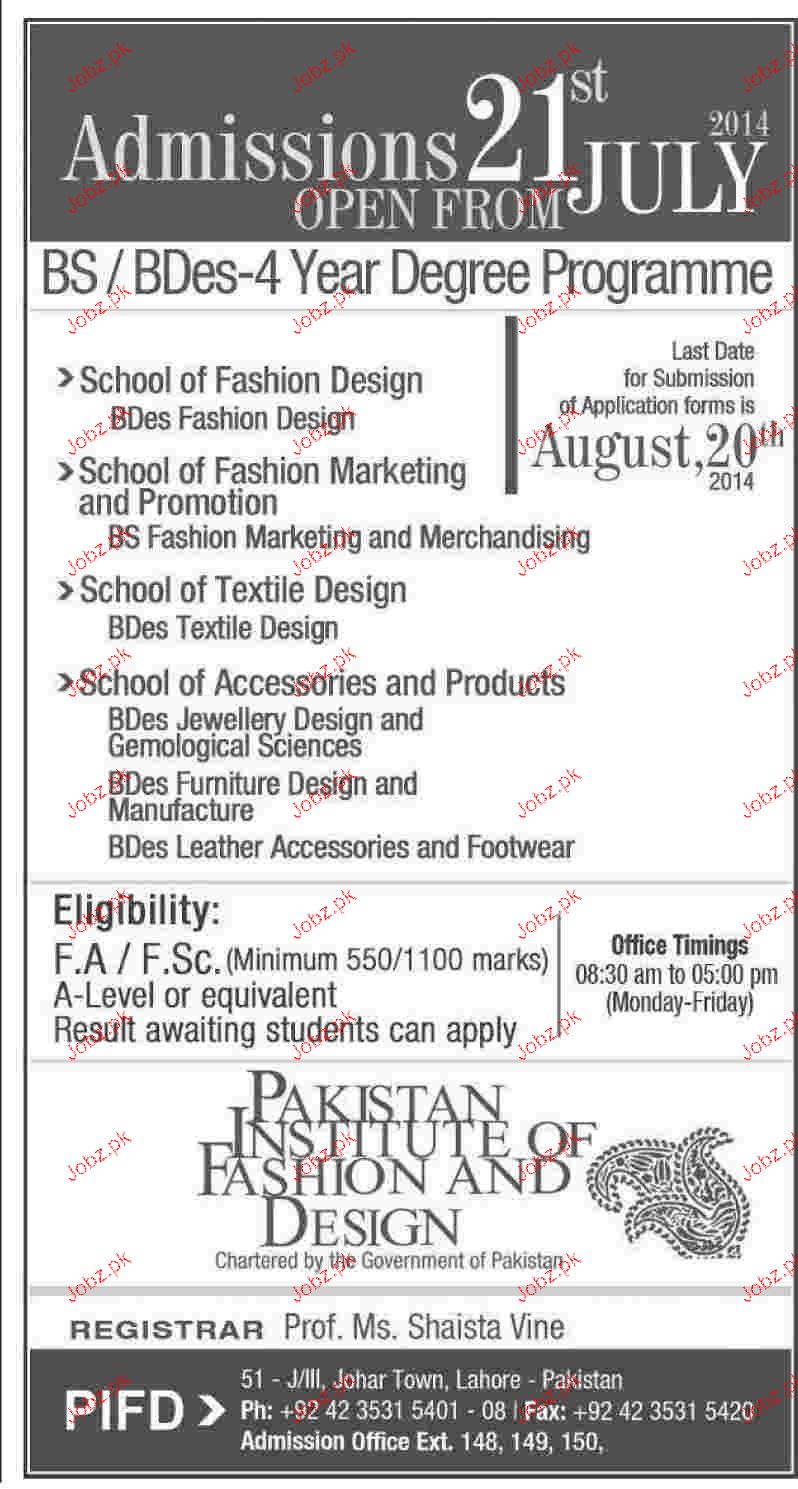 Pakistan Institute of Fashion Design and Fashion Admission in BA in Lahore. Read newspaper ad for exact details.