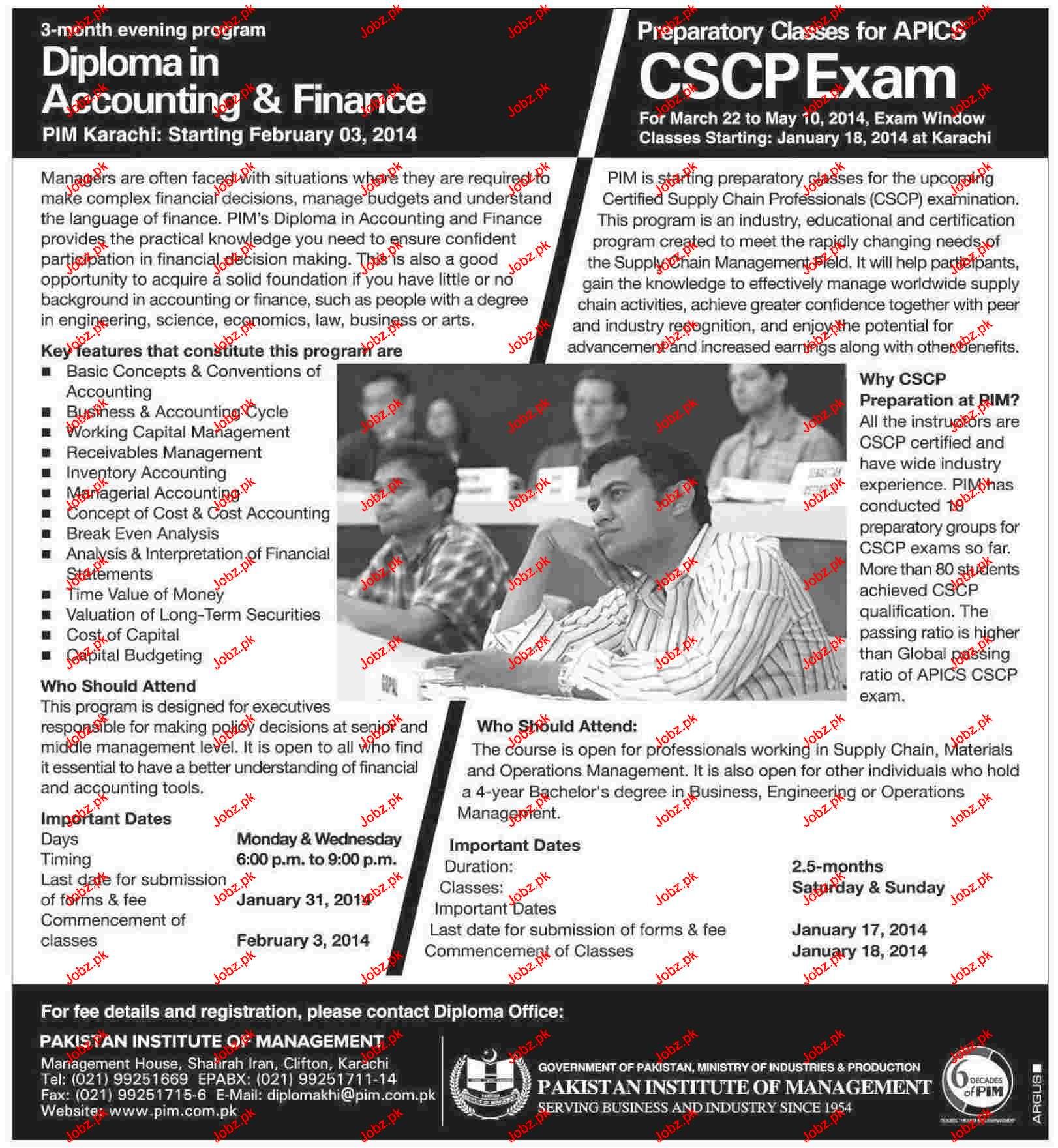 Pakistan Institute of Management Admission in Diploma in Accounting and Finance in Karachi Read newspaper ad for exact details.